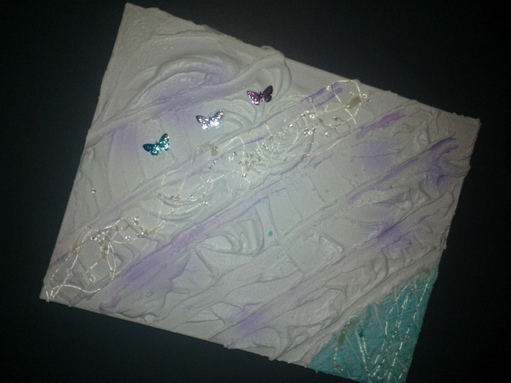 Can you imagine all the fun you can have? Old earrings? Glitters, marbles, whatever you want. I used hot glue on the top to add more texture and dimension. You can even add things after it dries. The thicker the mixture, the more items you can press into it. But be warned if the mixture is too thick, it will peel and crack right off that canvas when it dries.