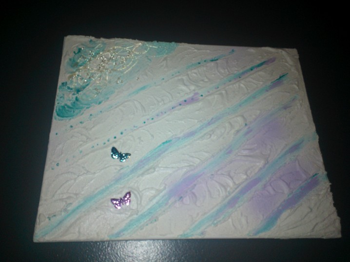There are a couple of websites I found on Pinterest on how to make your own glitter and paint. You know that’s on my Pinterest Re do list. I liked the spray paint because it seemed to absorb better, however there is no control. You can also try separate mixtures of colors as well for more color technique. I had a few things in my craft boxes, clear beads and scrapbooking butterflies that you can get from the Dollar store.